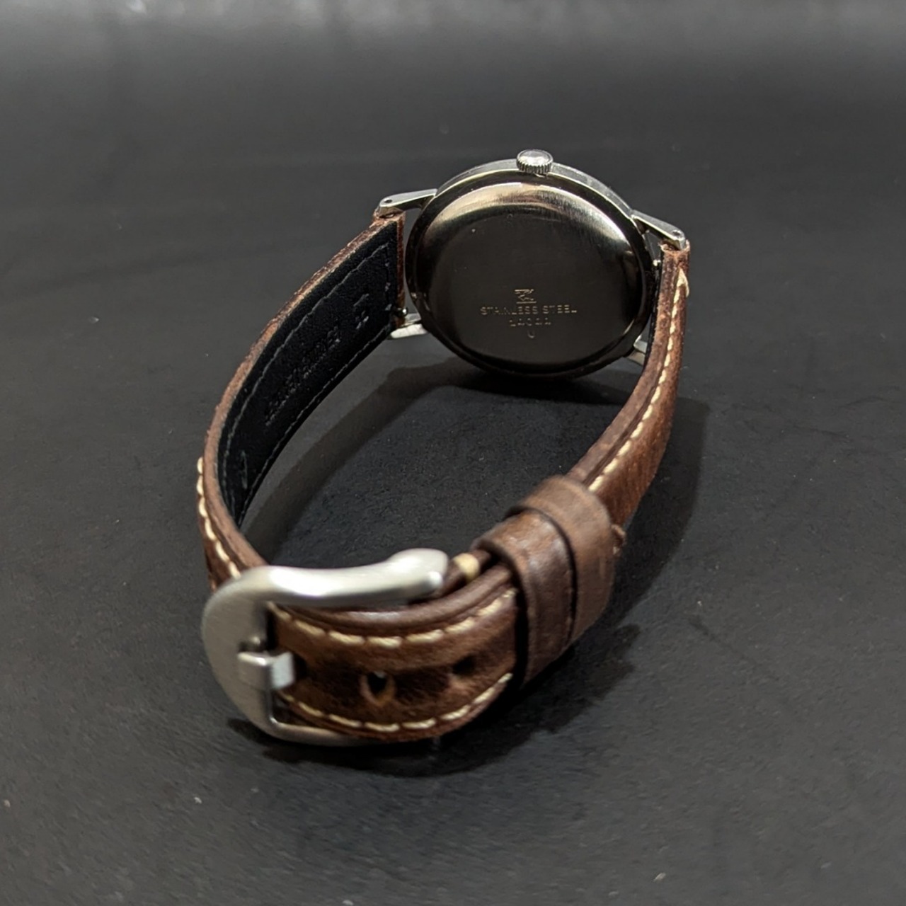 ハンドメイドレザークラフトの自社工房を持つノウハウや、知識を詰め込み、大手ベルト製造企業へ生産を委託したレザーベルト。 構造から、縫製技術はもちろん、使用する革のグレードについても見極め製造した本格派の腕時計用ベルトです。 歴史あるレザー産業の品質を保持する為につくられた組合『THE CONSORTIUM』に所属したイタリア屈指のタンナーでなめされた高品質なフルベジタブルタンニンなめしのレザー"MPG製"を使用しています。 シッカリとオイルを含んだオイルレザーは、しっとりとなめらかな質感で、柔らかく付けごこち抜群です! 革の密度の状態により、色味、表情が変わるのが特徴で、ヴィンテージ感あるおしゃれなメンズ用ベルトです。