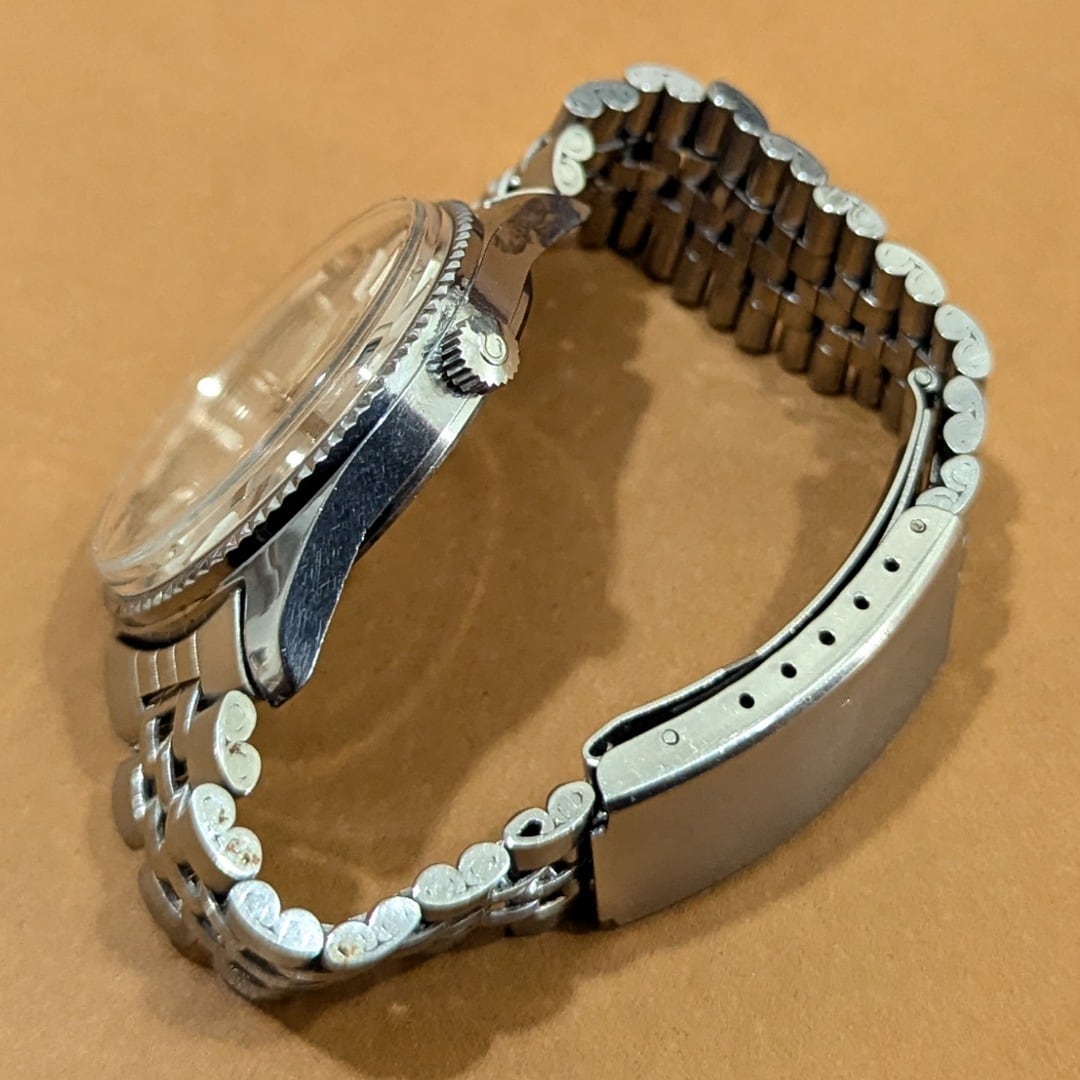 キャリバーは、1962年に設計を開始された1802を搭載。文字盤に汚れがございますが、ベルト、リューズも純正のとても綺麗な個体です。 針の蓄光もきれいな状態で残っています。 かなり綺麗な美品になります。