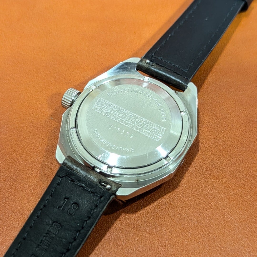バックケースのシリアル番号の刻印、文字盤の6時位置にプリントされた『CCCP製』の記載から、1980年代に製造された個体と考えられます。
