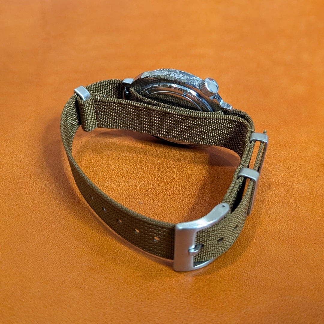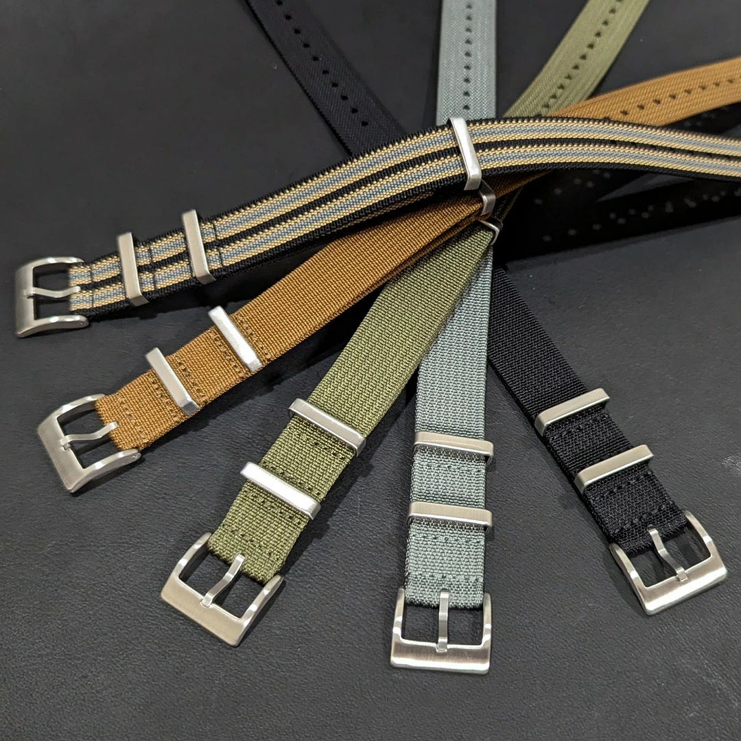 厚さ約1.25mmのリブ編みNATOベルトになります。 当社では、十数年に渡り、数多くのナイロンベルトを販売して参りました。 高品質な製品を追い求め、多くの製造元より、サンプルを取り寄せ選定し、自信をもって提供出来る製造元へ依頼し、商品化したイチオシのNATOベルトです。 日本人にフィットするサイズ(全長約280mm)にて仕立てています。 色は、5色ご用意しております。 ビンテージウォッチに相応しい高品質なNATOベルトを体感してほしい。