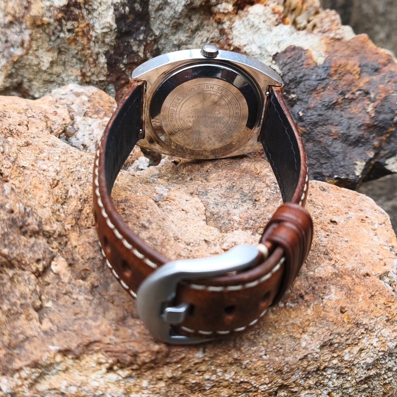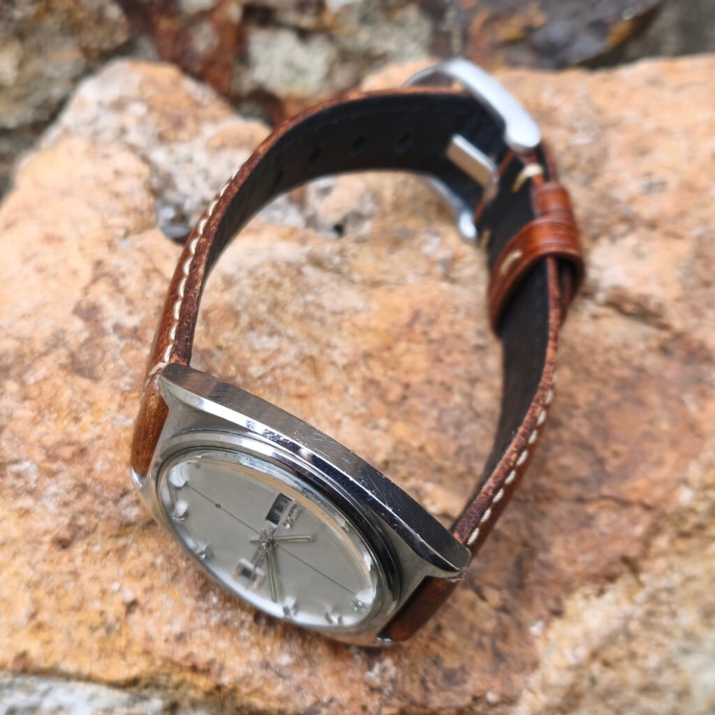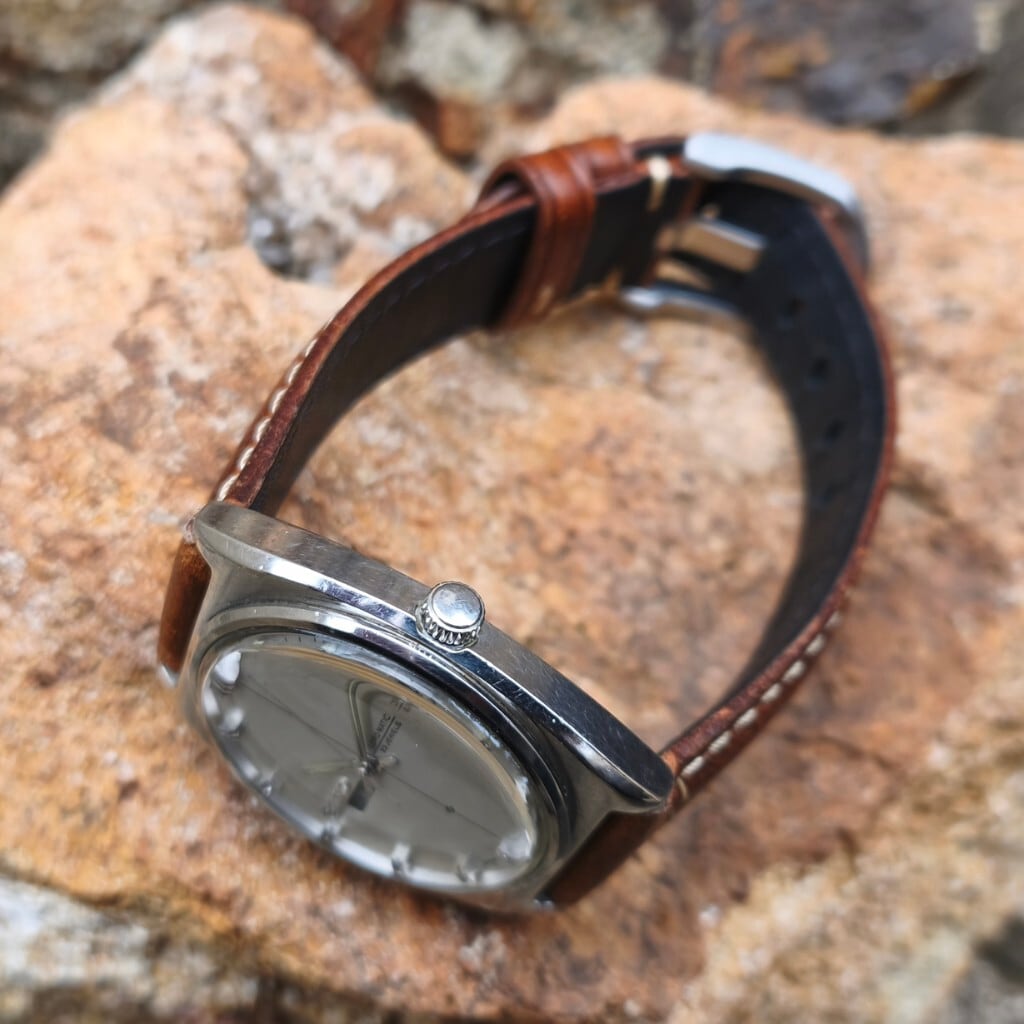 ストレートのラグに丸文字盤、初期型ならではのドーム型アクリル風防が、時代の転換期に生産されたことを物語るレトロヴィンテージウォッチ。