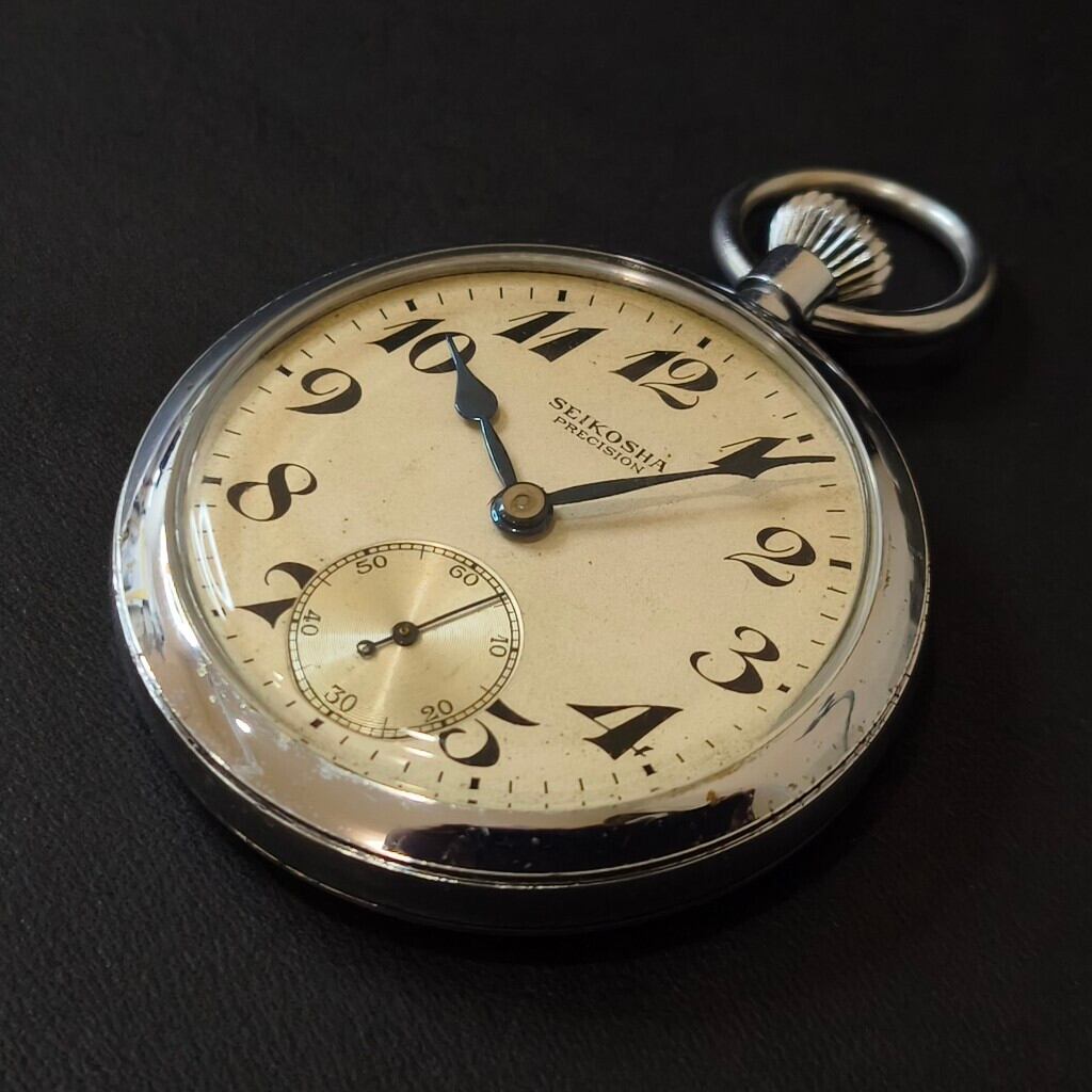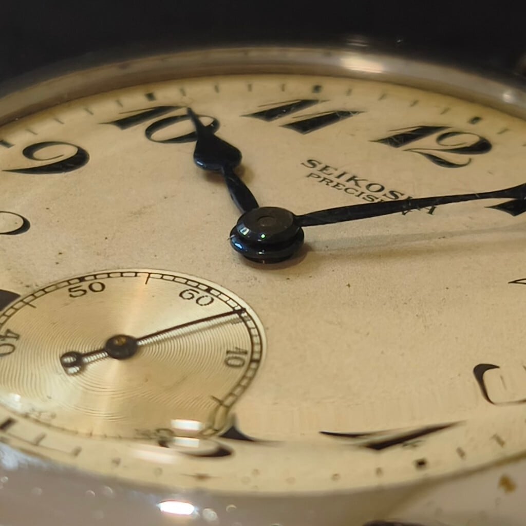 青焼針が光る歴史を感じさせ、吊カンが楕円型と二針の前期型モデルで、ロゴがSEIKOへ変更される前の個体で、SEIKOSHAロゴが歴史を感じさせる一品です。