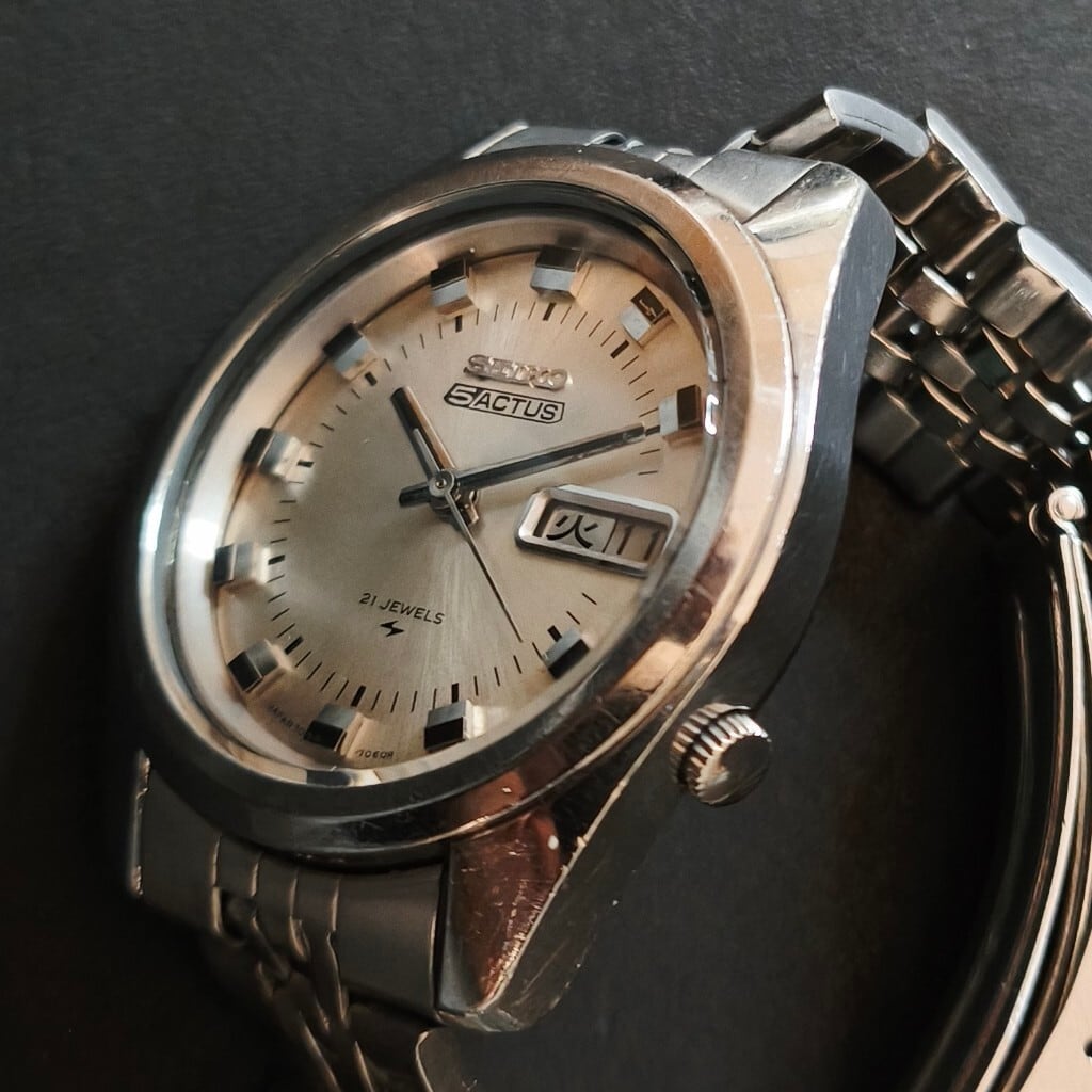 1970年1月に精工舎亀戸工場により生産された70系ムーブメント搭載、プラ風防の『5アクタス』
