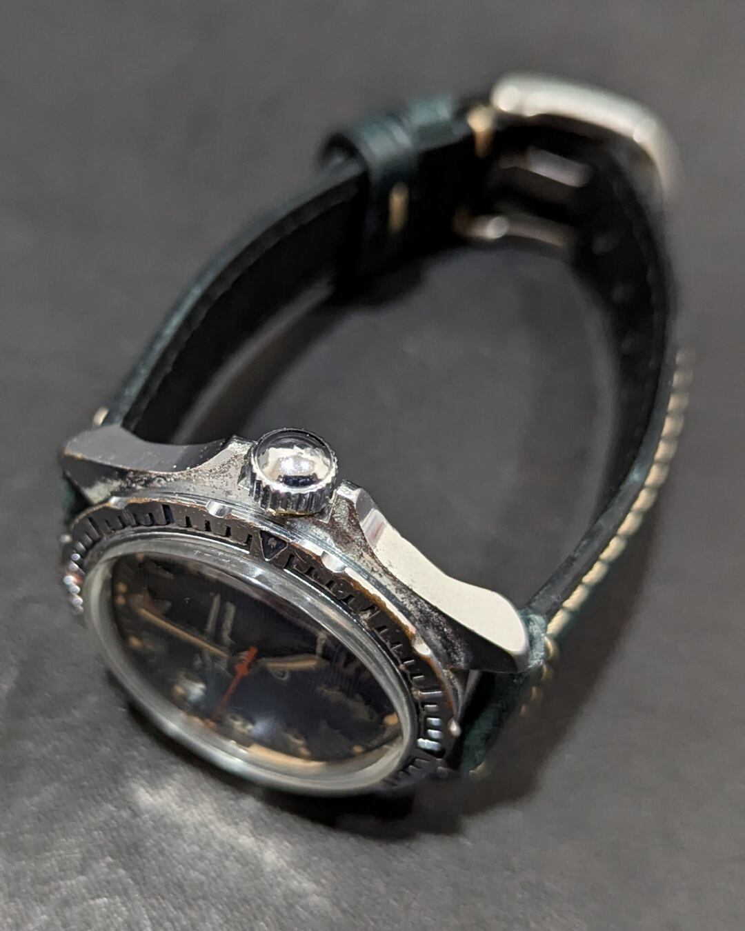 リューズ、ケース、文字盤など、全体的に経年劣化はございますが、綺麗な腕時計です。