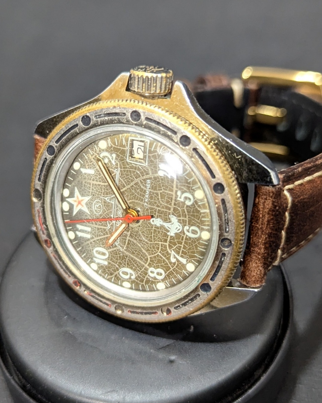文字盤は、BOSTOK特有の経年劣化による文字盤のひび割れ、コレクターの間では、『スパイダー文字盤』と呼ばれることがある唯一無二の変化。 文字盤のペイントが、クモの巣のようにひび割れる変化! 文字盤全体に均一にクラックが入りとても綺麗な変化をしたレアな一品です。ここまで、綺麗なひび割れは、珍しいと思います。